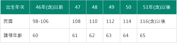 ※上開請領年齡自98年至106年為60歲,107年提高為61歲,109年提高為62歲,111年提高為63歲,113年提高為64歲,115年以後為65歲。