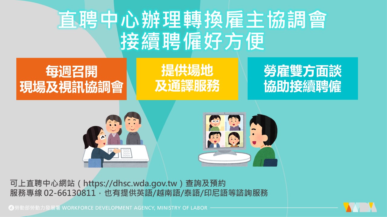 發展署進一步表示,直聘中心自109年起推動辦理接續聘僱在臺移工服務,每週召開轉換雇主實地及視訊協調會,為直聘雇主及等待轉換之移工提供場地及通譯,供雙方面談接續聘僱事宜,迄今媒合服務的移工人數達1,300餘人。