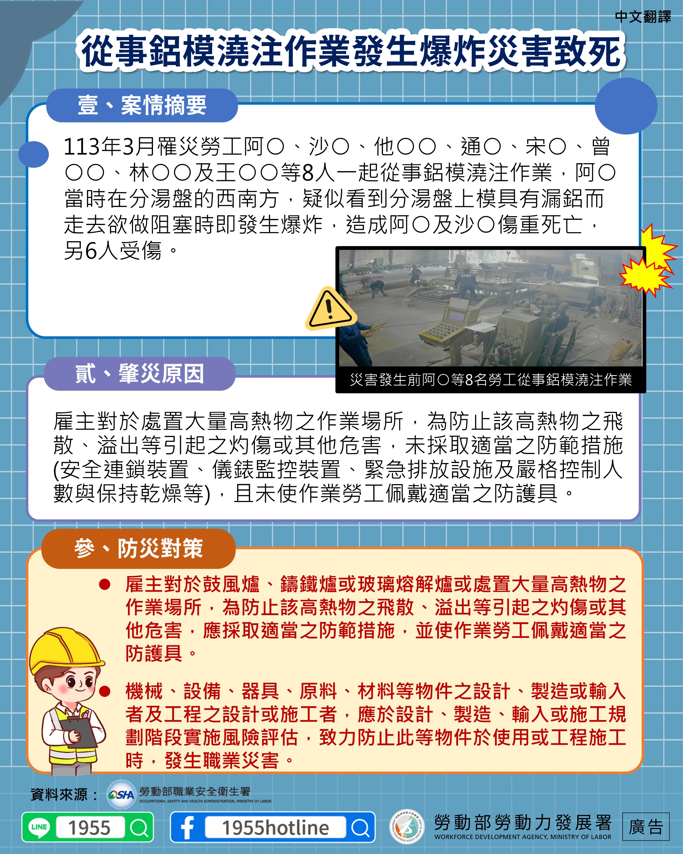 113年3月罹災勞工阿○、沙○、他○○、通○、宋○、曾○○、林○○及王○○等8人一起從事鋁模澆注作業,阿○當時在分湯盤的西南方,疑似看到分湯盤上模具有漏鋁而走去欲做阻塞時即發生爆炸,造成阿○及沙○傷重死亡,另6人受傷。