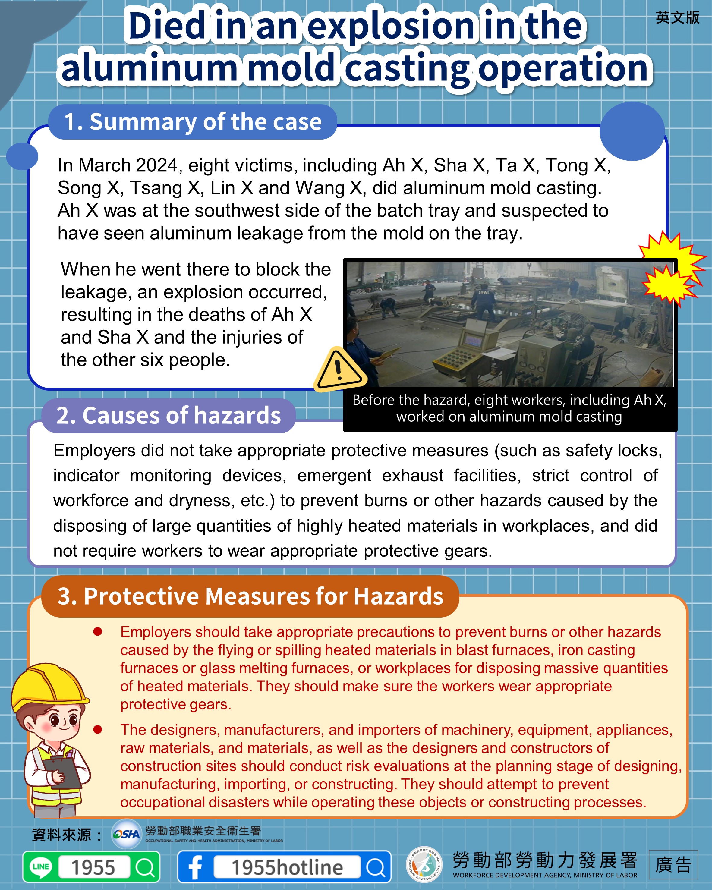 In March 2024, eight victims, including Ah X, Sha X, Ta X, Tong X, Song X, Tsang X, Lin X and Wang X, did aluminum mold casting. Ah X was at the southwest side of the batch tray and suspected to have seen aluminum leakage from the mold on the tray. When he went there to block the leakage, an explosion occurred, resulting in the deaths of Ah X and Sha X and the injuries of the other six people.