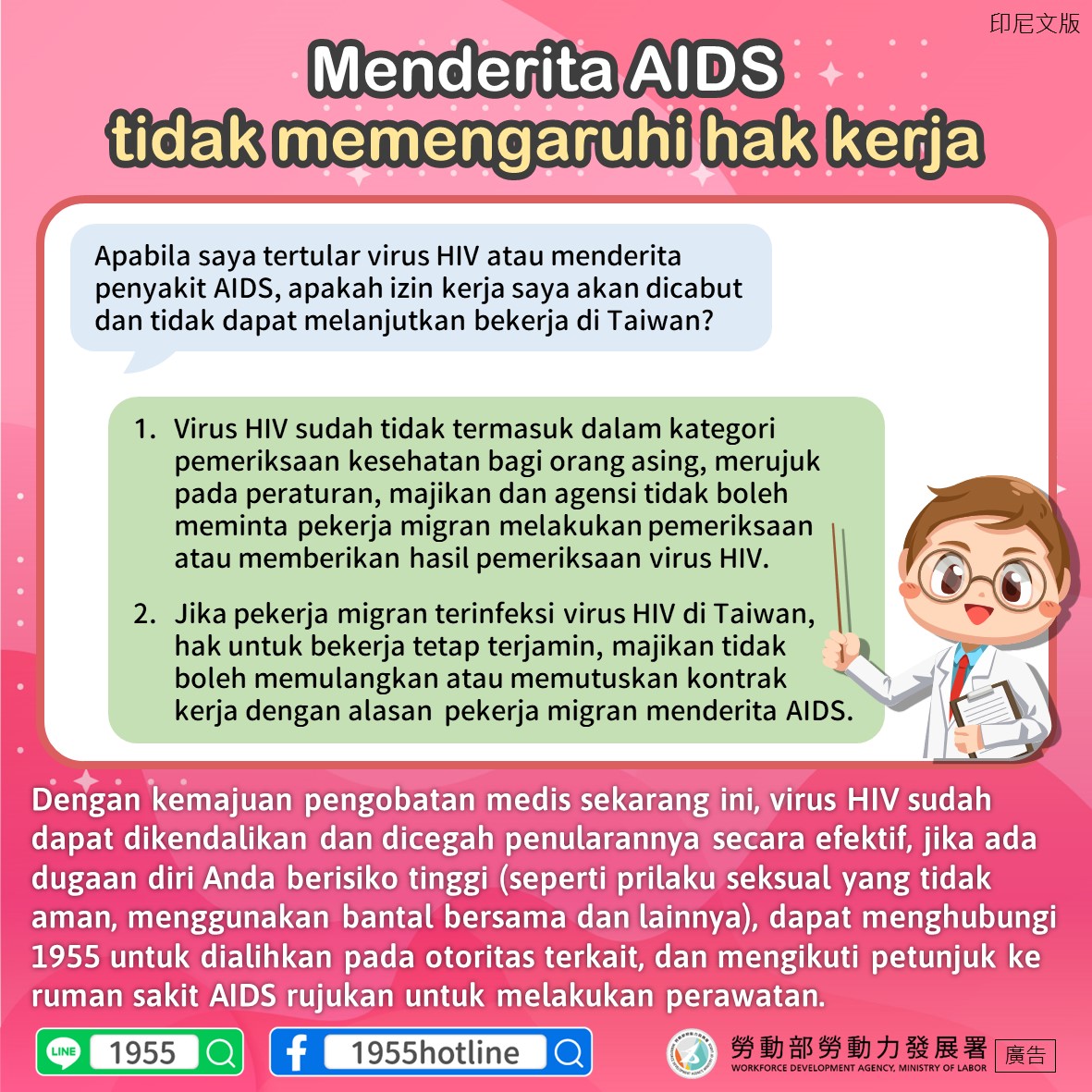 Contracting AIDS does not impact a foreign worker’s right to work If a foreign worker contracts HIV or AIDS is their employment permit revoked? Are they unable to continue working in Taiwan? 1. HIV is not included on the health examination for foreign workers. It is illegal for employers or labor brokers to require that foreign workers be tested for HIV/AIDS or provide test results indicating they have not contracted the virus. 2. If a foreign worker contracts HIV in Taiwan, his/her right to work remains protected. Employers cannot send a foreign worker home or terminate their labor contract because they contract AIDS. Based on advances in modern medicine, HIV can be effectively controlled and infection prevented. If an individual is concerned he/she might have been exposed through high risk behavior (engaging in unsafe sex or sharing hypodermic needles) call the 1955 hotline to be put in touch with related experts, and be given information on designated hospitals. 印尼文版 ▍Menderita AIDS tidak memengaruhi hak kerja Apabila saya tertular virus HIV atau menderita penyakit AIDS, apakah izin kerja saya akan dicabut dan tidak dapat melanjutkan bekerja di Taiwan? 1. Virus HIV sudah tidak termasuk dalam kategori pemeriksaan kesehatan bagi orang asing, merujuk pada peraturan, majikan dan agensi tidak boleh meminta pekerja migran melakukan pemeriksaan atau memberikan hasil pemeriksaan virus HIV. 2. Jika pekerja migran terinfeksi virus HIV di Taiwan, hak untuk bekerja tetap terjamin, majikan tidak boleh memulangkan atau memutuskan kontrak kerja dengan alasan pekerja migran menderita AIDS. Dengan kemajuan pengobatan medis sekarang ini, virus HIV sudah dapat dikendalikan dan dicegah penularannya secara efektif, jika ada dugaan diri Anda berisiko tinggi (seperti prilaku seksual yang tidak aman, menggunakan bantal bersama dan lainnya), dapat menghubungi 1955 untuk dialihkan pada otoritas terkait, dan mengikuti petunjuk ke ruman sakit AIDS rujukan untuk melakukan perawatan.