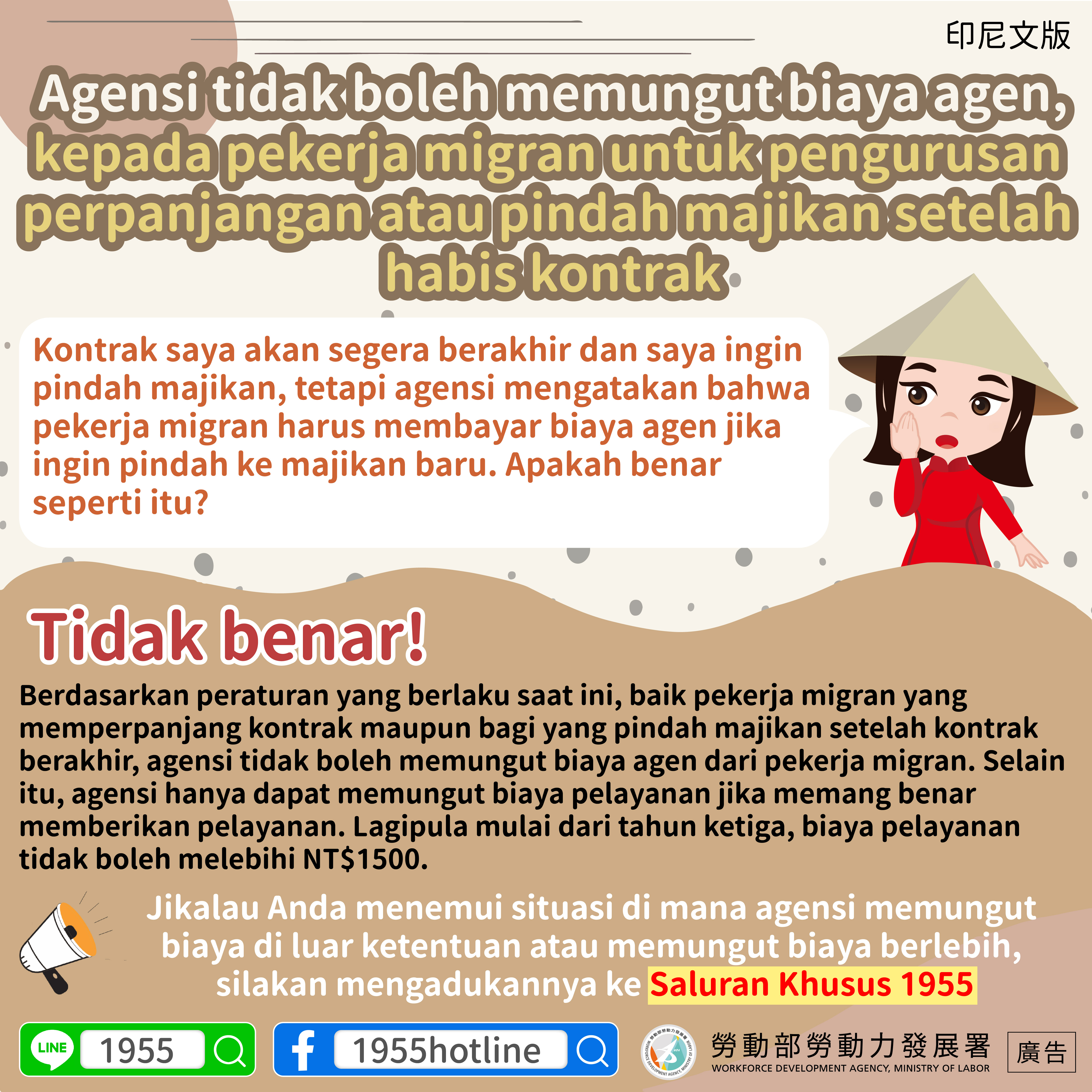 Jikalau Anda menemui situasi di mana agensi memungut biaya di luar ketentuan atau memungut biaya berlebih, silakan mengadukannya ke Saluran Khusus 1955
